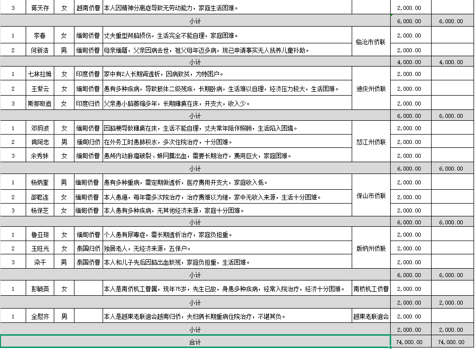 按照《云南华商公益基金会“助侨惠侨”专项基金实施方案》,为精准做好助侨惠侨工作,在各地州侨联(联谊会)前期摸排困难归侨侨眷基本情况、侨眷侨属困难学生情况,向各县(市)区基层侨联进行深入了解,通过基层侨联党组会研究推荐,结合个人实际困难等情况经向省侨联汇报,并基金会第三届理事会第二次会议通过,拟按《方案》执行(2024-1)帮扶计划。现将受助人信息公示,若有异议请联系云南华商公益基金会。